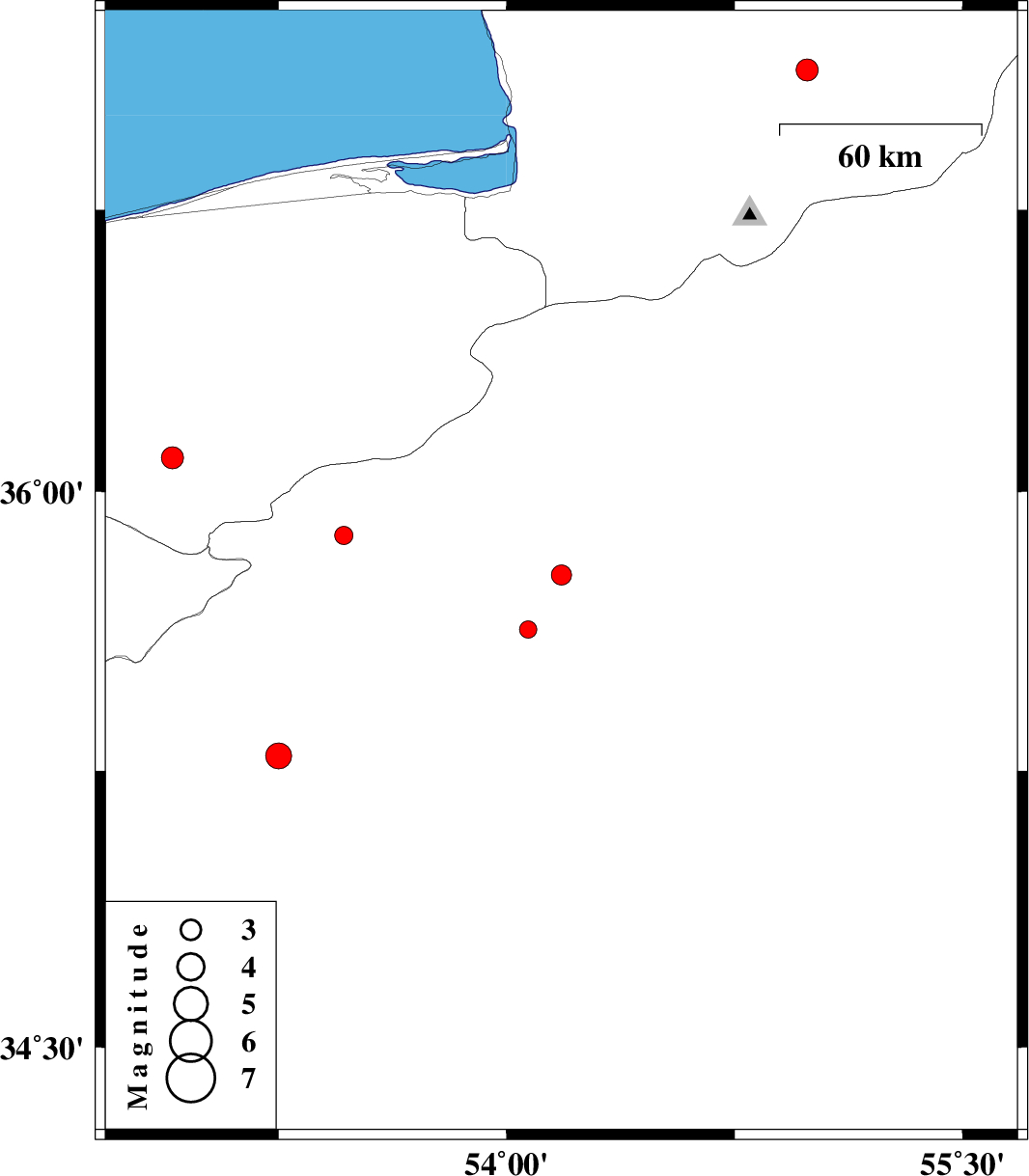 | 2015/06/20 | 02:59:22.4 | 07:29:22.4 | 35.63 | 54.07 | 14 | ML:2.5 | Semnan Province, 61 km East of Semnan |