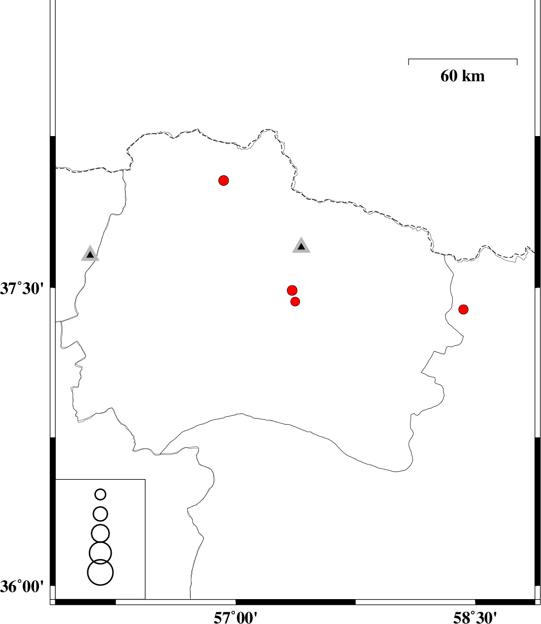 | 2015/07/20 | 09:22:53.1 | 13:52:53.1 | 37.39 | 58.425 | 14 | ML:2.7 | Khorasan(center) Province, 32 km North of Quchan |