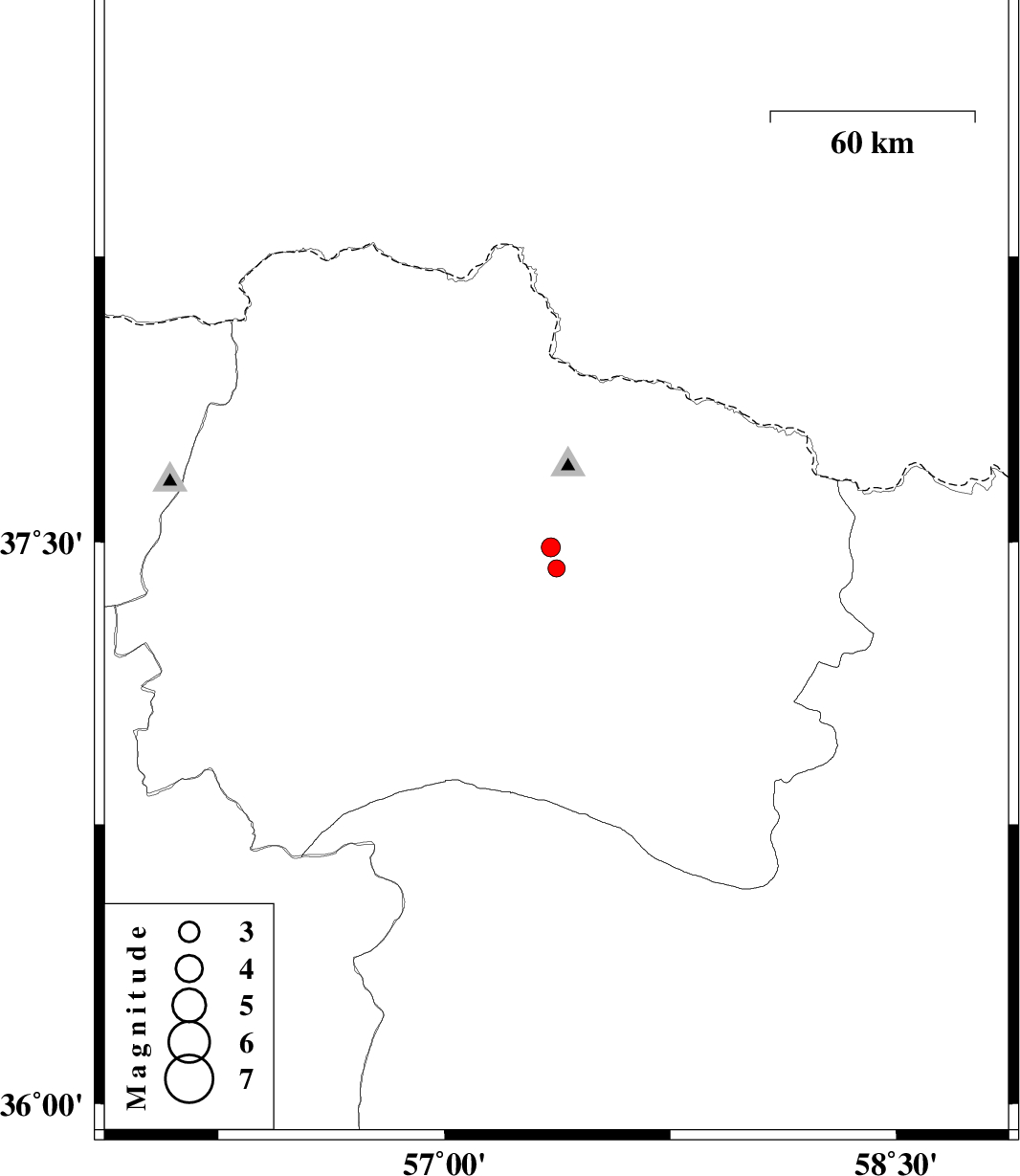 | 2015/08/05 | 16:46:44.1 | 21:16:44.1 | 37.43 | 57.372 | 14 | ML:2.6 | Khorasan(north) Province, 6 km of Bojnurd | ||