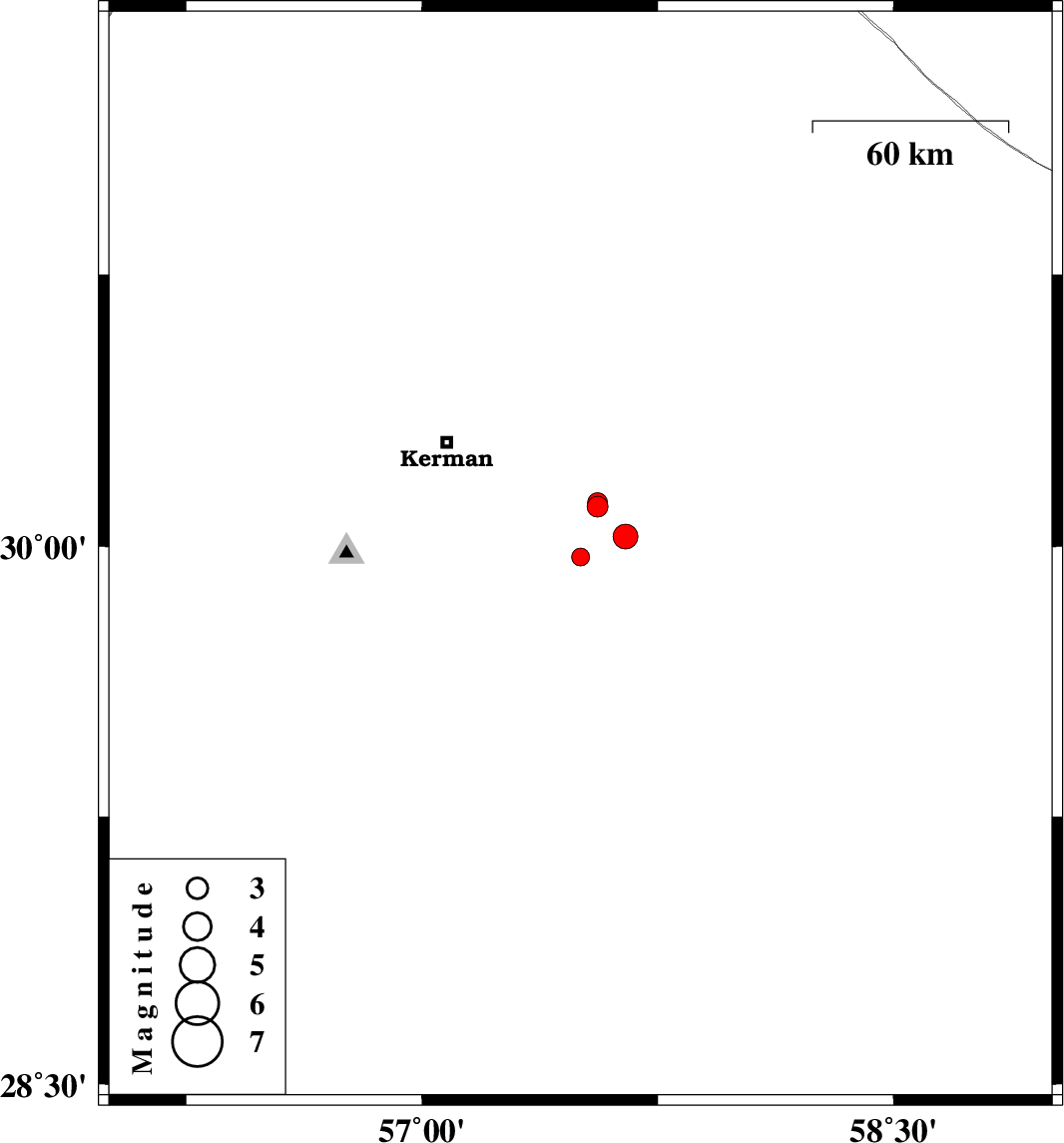 | 2015/08/02 | 16:03:17.3 | 20:33:17.3 | 30.121 | 57.558 | 14 | ML:2.8 | Kerman Province, 50 km South-East of Kerman |