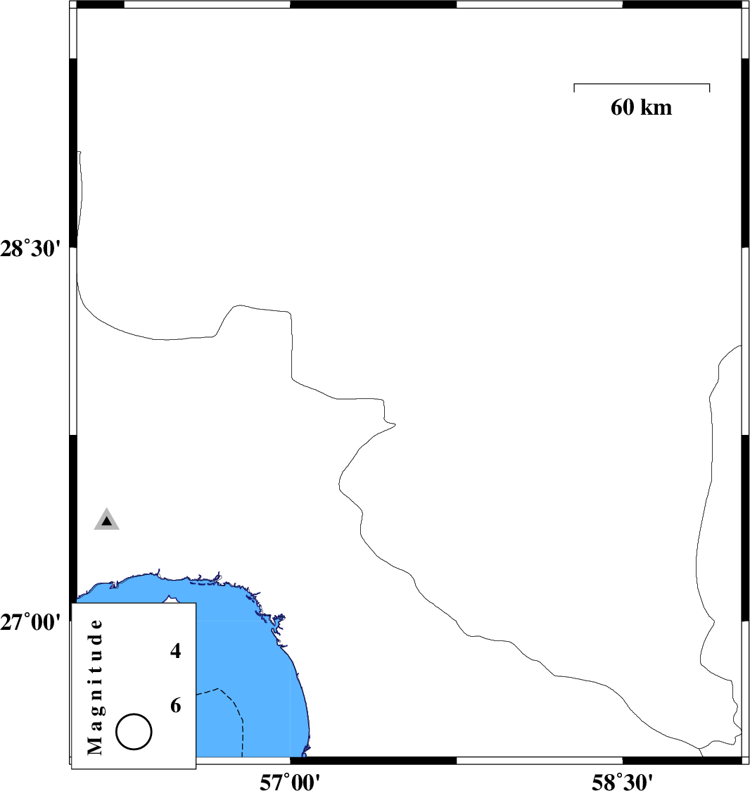 | 2015/08/11 | 02:59:49.6 | 07:29:49.6 | 28.38 | 57.035 | 16 | ML:3.1 | Kerman Province, 76 km South-West of Jiroft |