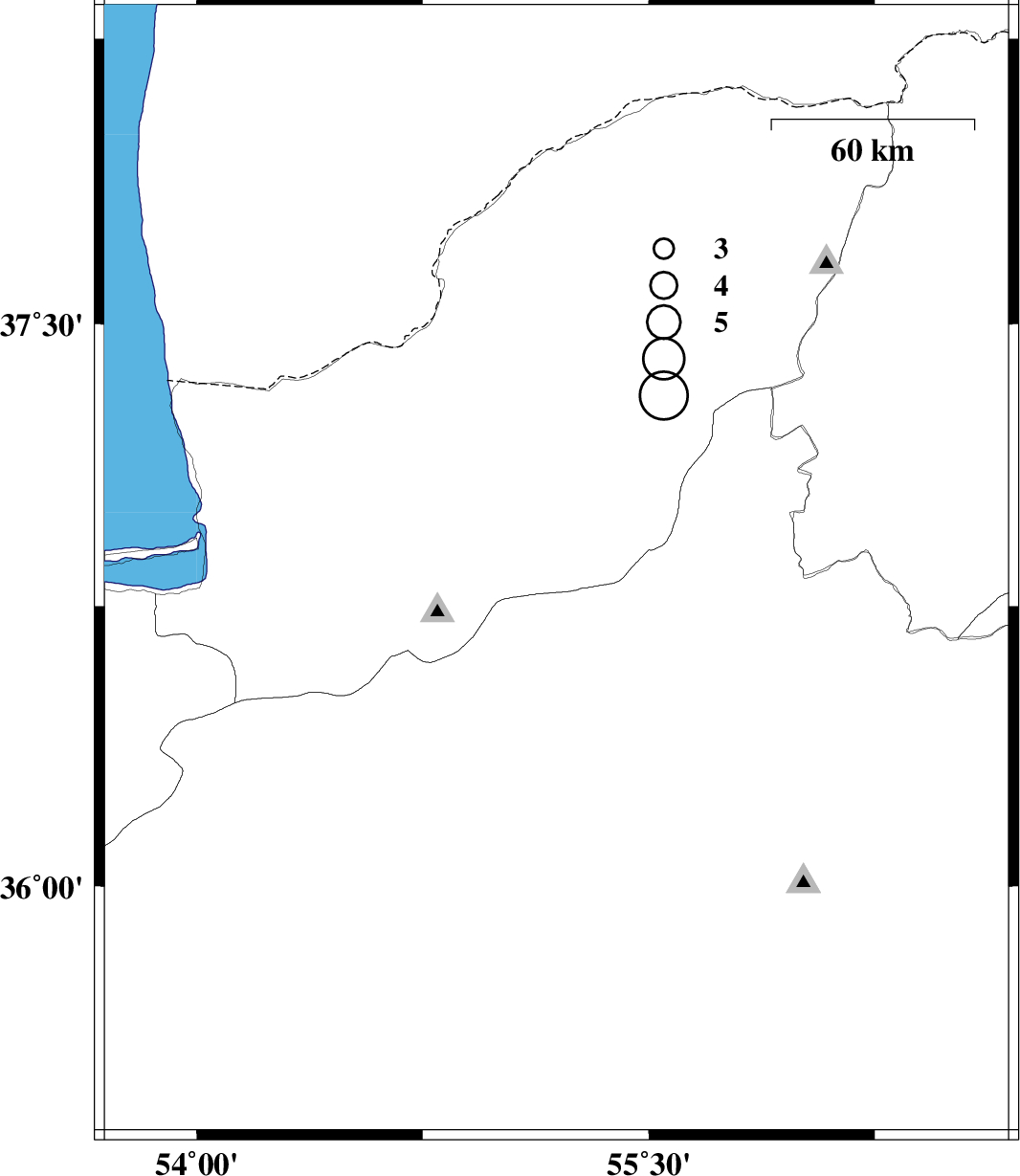 | 2015/08/17 | 20:37:20.0 | 01:07:20.0 | 36.822 | 55.085 | 6 | ML:2.7 | Golestan Province, 22 km South of Ramian | ||