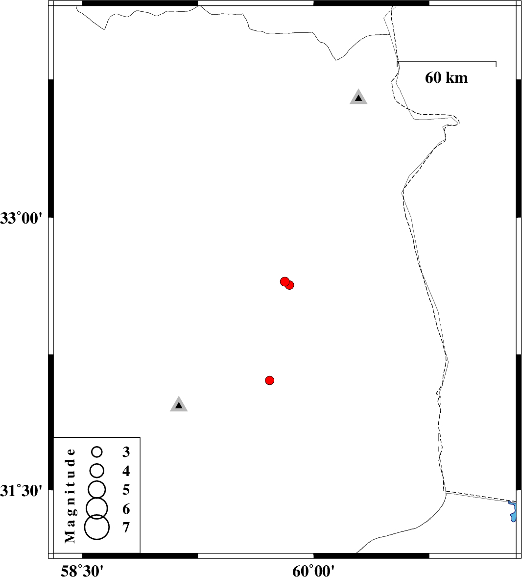 | 2015/08/28 | 14:55:22.4 | 19:25:22.4 | 32.649 | 59.813 | 6 | ML:2.7 | Khorasan(south) Province, 4 km of Sarbisheh | ||
