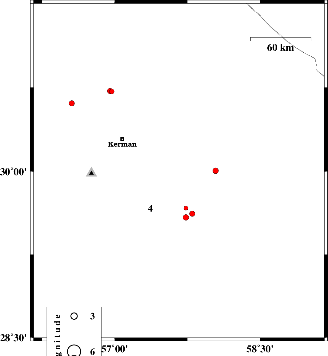 | 2015/09/04 | 15:32:31.5 | 20:02:31.5 | 29.963 | 57.598 | 15 | ML:2.7 | Kerman Province, 62 km South-East of Kerman | ||