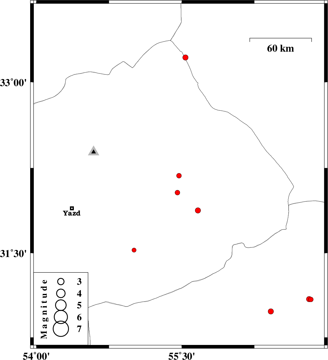 | 2015/09/10 | 09:36:54.6 | 14:06:54.6 | 32.182 | 55.472 | 14 | ML:2.2 | Yazd Province, 65 km North of Bafq | ||