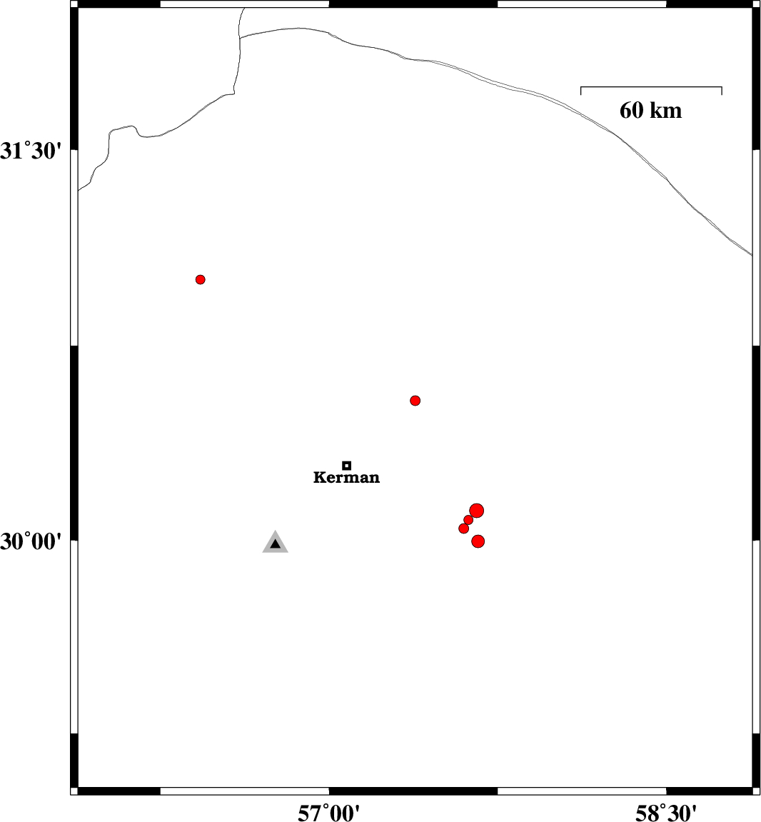 | 2015/09/16 | 22:03:54.1 | 02:33:54.1 | 30.539 | 57.383 | 14 | ML:2 | Kerman Province, 40 km North-East of Kerman | ||
