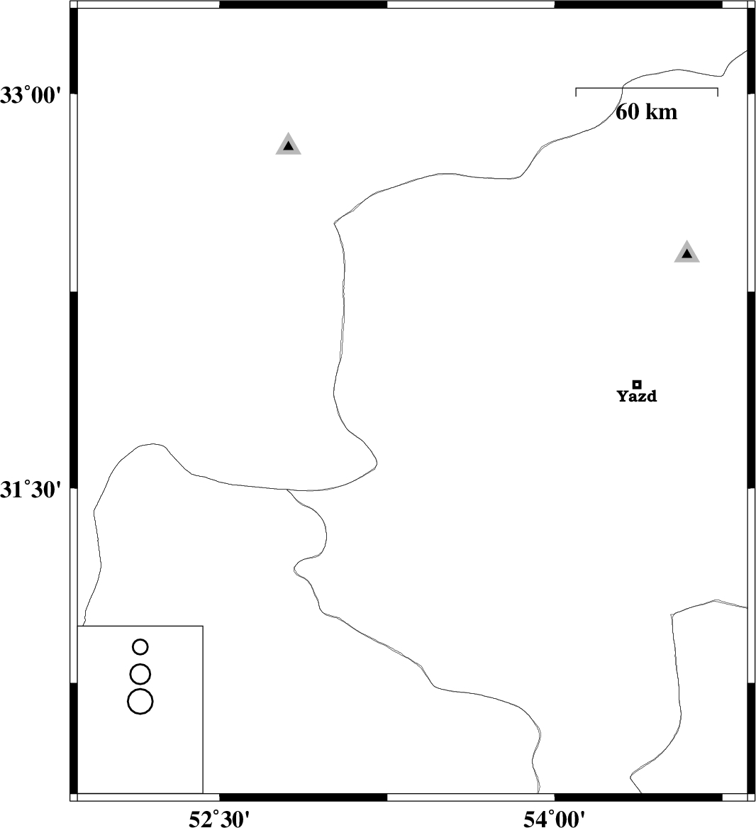 | 2015/09/17 | 07:51:00.5 | 12:21:00.5 | 31.821 | 53.363 | 14 | ML:1.6 | Yazd Province, 78 km North of Abarkuh |