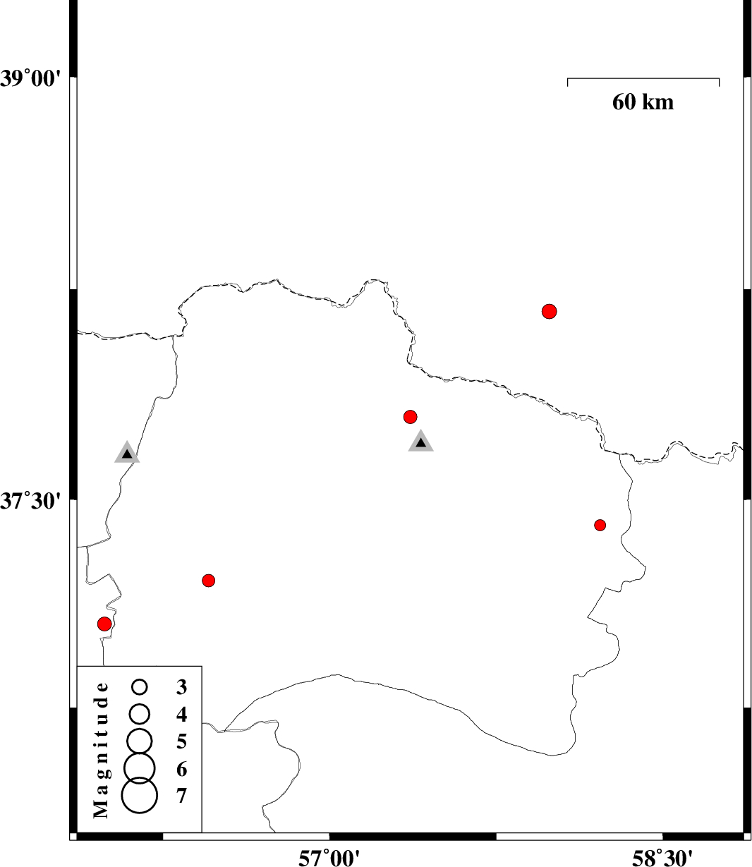 | 2015/09/22 | 09:08:56.7 | 12:38:56.7 | 37.795 | 57.363 | 14 | ML:2.7 | Khorasan(north) Province, 36 km North of Bojnurd | ||