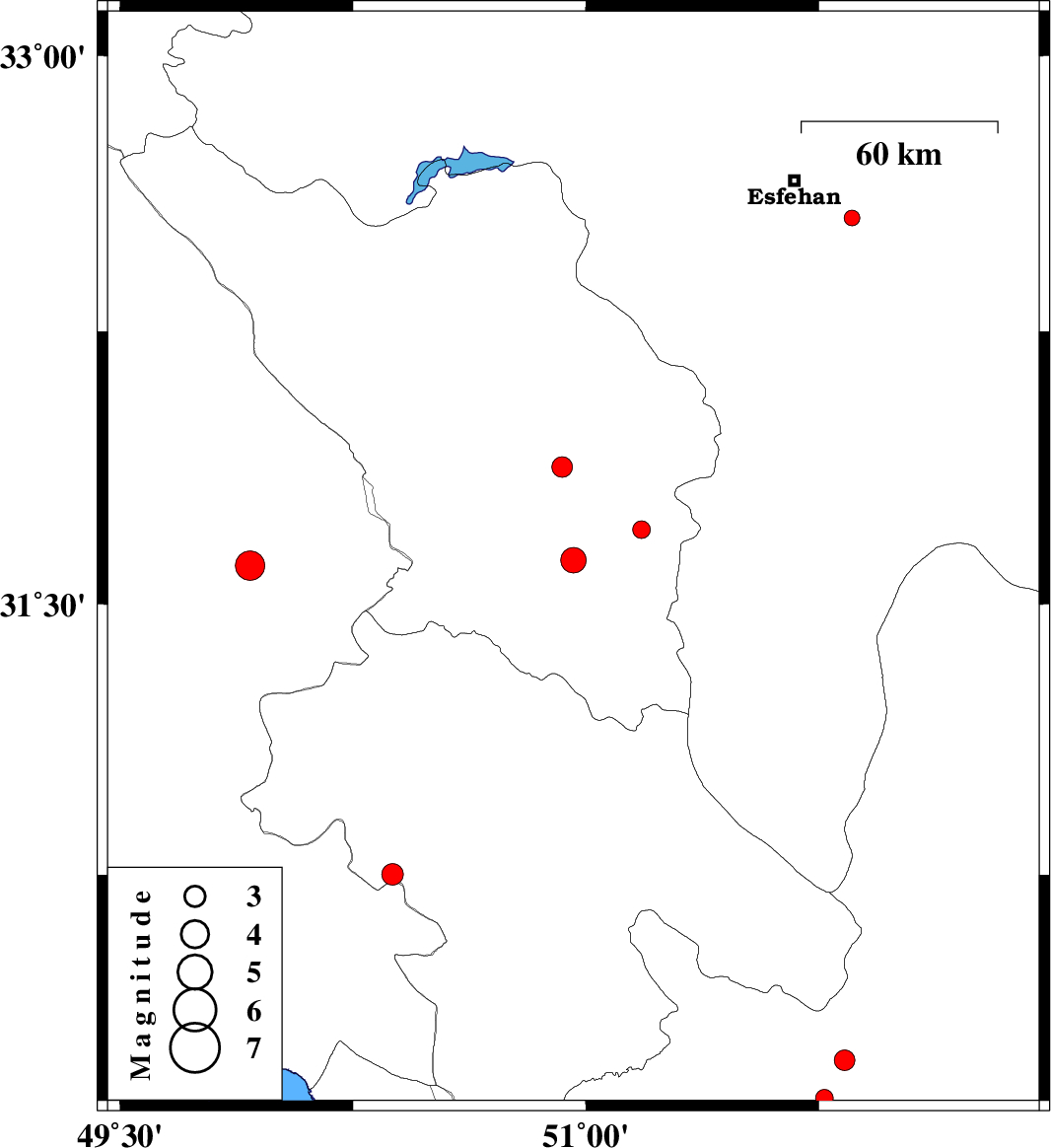 | 2015/09/20 | 13:28:48.8 | 17:58:48.8 | 32.559 | 51.857 | 14 | ML:2.3 | Esfahan Province, 21 km South-East of Esfahan | ||