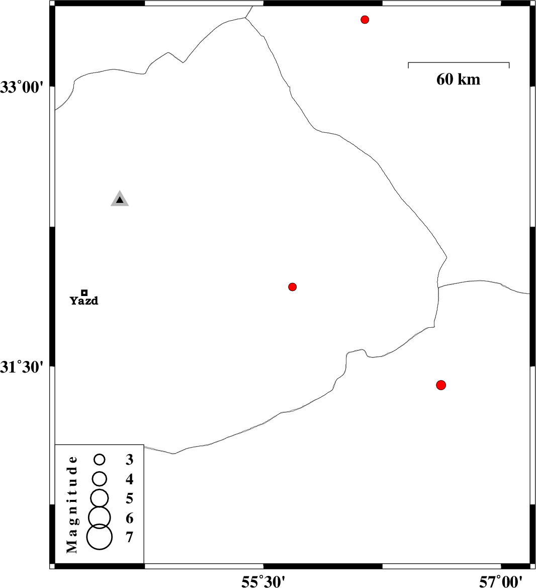 | 2015/09/27 | 09:05:15.3 | 12:35:15.3 | 31.927 | 55.682 | 9 | ML:2.2 | Yazd Province, 45 km North-East of Bafq | ||