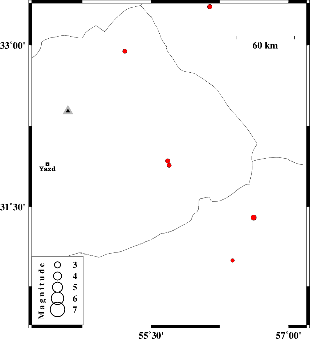 | 2015/09/27 | 09:05:15.3 | 12:35:15.3 | 31.927 | 55.682 | 9 | ML:2.2 | Yazd Province, 45 km North-East of Bafq | ||