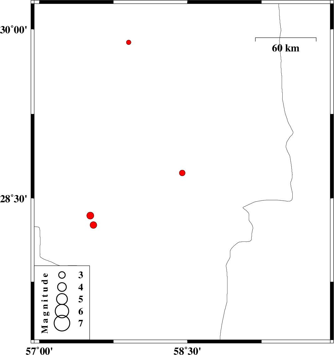 | 2015/09/26 | 10:37:28.1 | 14:07:28.1 | 29.884 | 57.905 | 14 | ML:2.1 | Kerman Province, 97 km North-West of Bam |