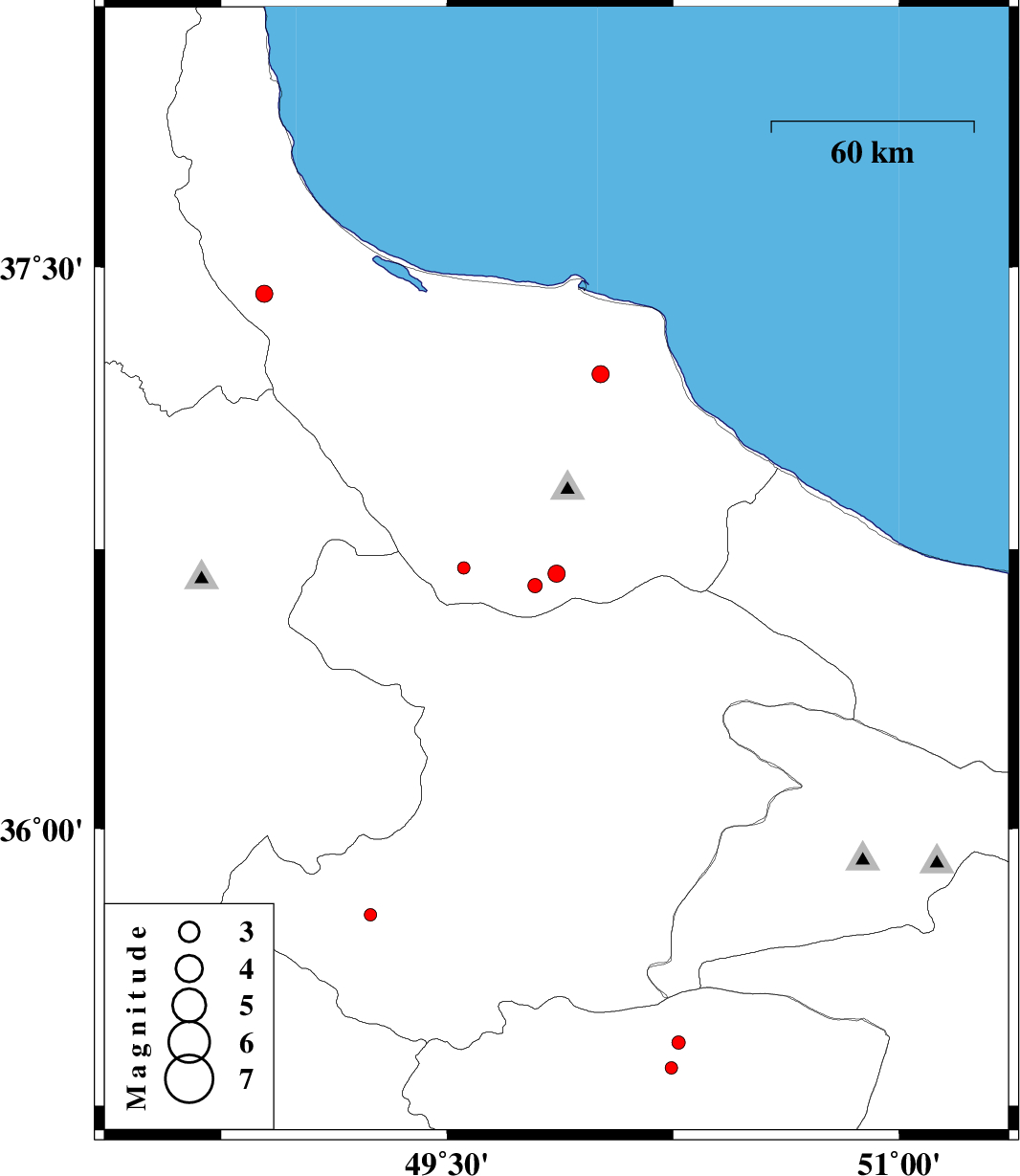 | 2015/10/03 | 15:26:18.2 | 18:56:18.2 | 36.685 | 49.863 | 14 | ML:2.6 | Gilan Province, 52 km South of Siahkal | ||