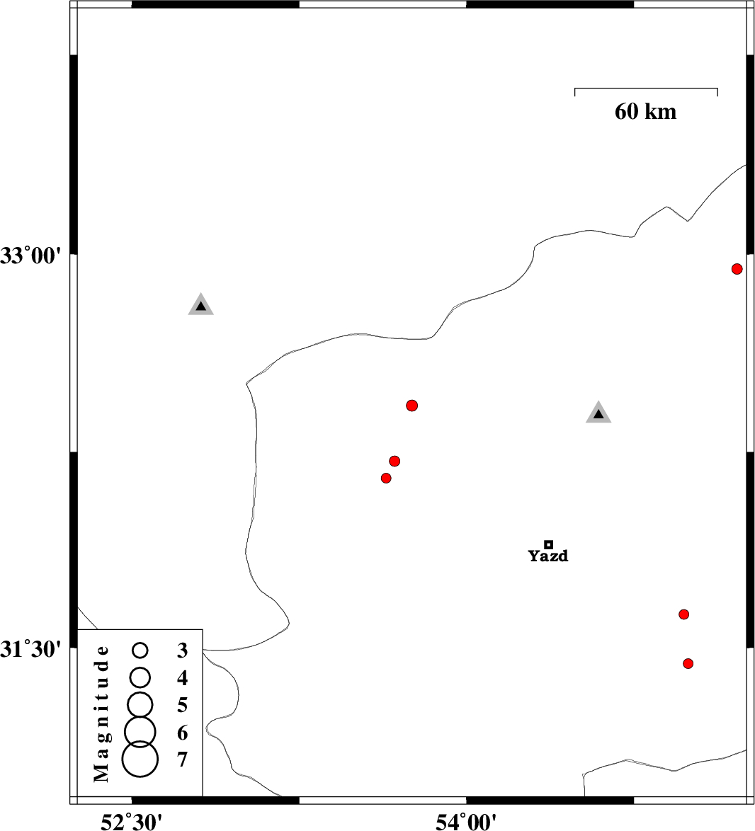 | 2015/09/29 | 19:30:39.4 | 23:00:39.4 | 32.944 | 55.213 | 18 | ML:2.1 | Yazd Province, 150 km North-West of Bafq |