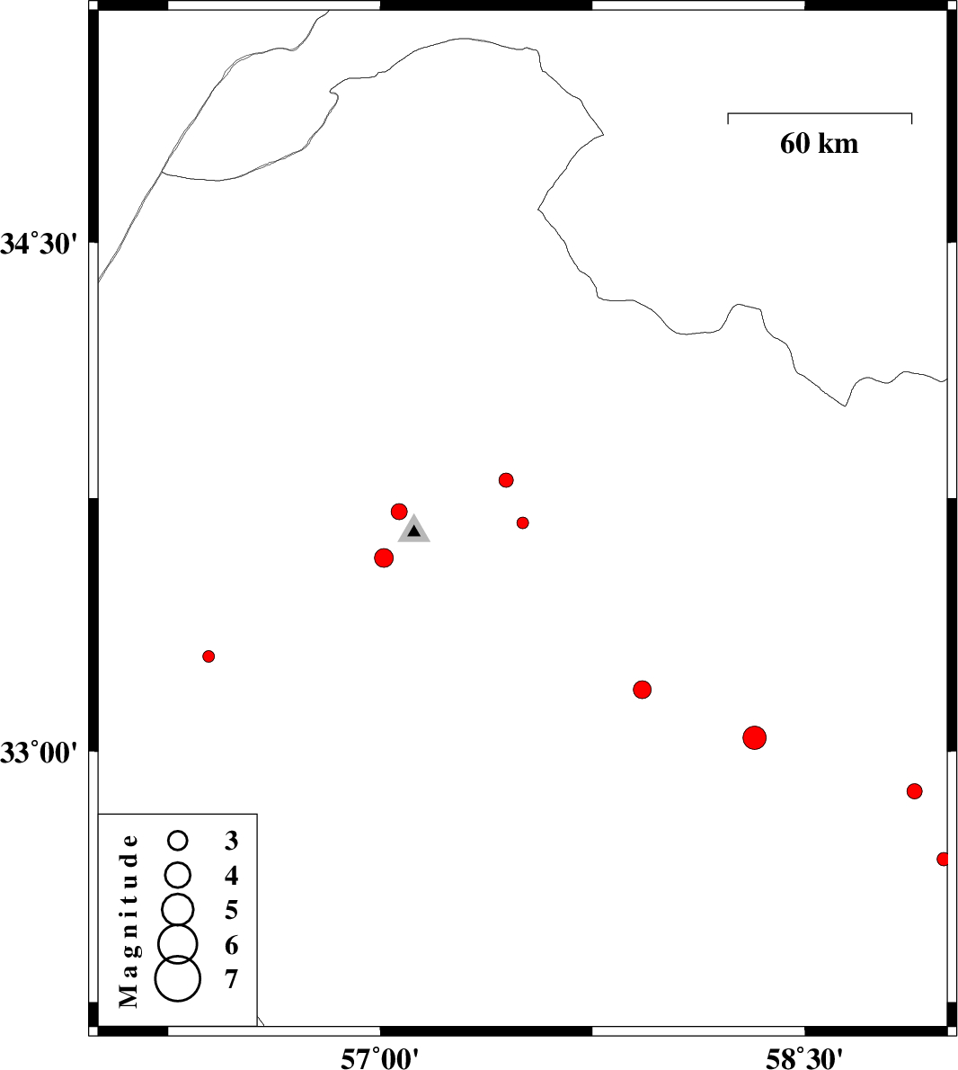 | 2015/09/22 | 09:20:53.8 | 12:50:53.8 | 33.573 | 57.013 | 7 | ML:3 | Yazd Province, 9 km of Tabas | ||