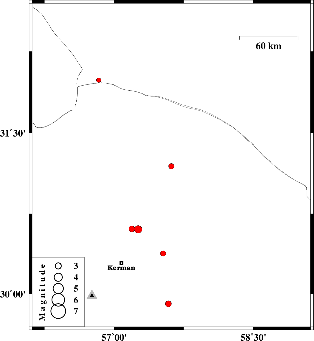 | 2015/10/09 | 06:55:55.9 | 10:25:55.9 | 30.603 | 57.259 | 14 | ML:3.7 | Kerman Province, 39 km North-East of Kerman | ||