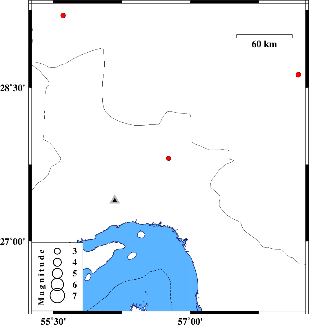 | 2015/10/10 | 00:32:19.3 | 04:02:19.3 | 27.812 | 56.762 | 16 | ML:2.3 | Hormozgan Province, 64 km North-West of Dehbarez | ||