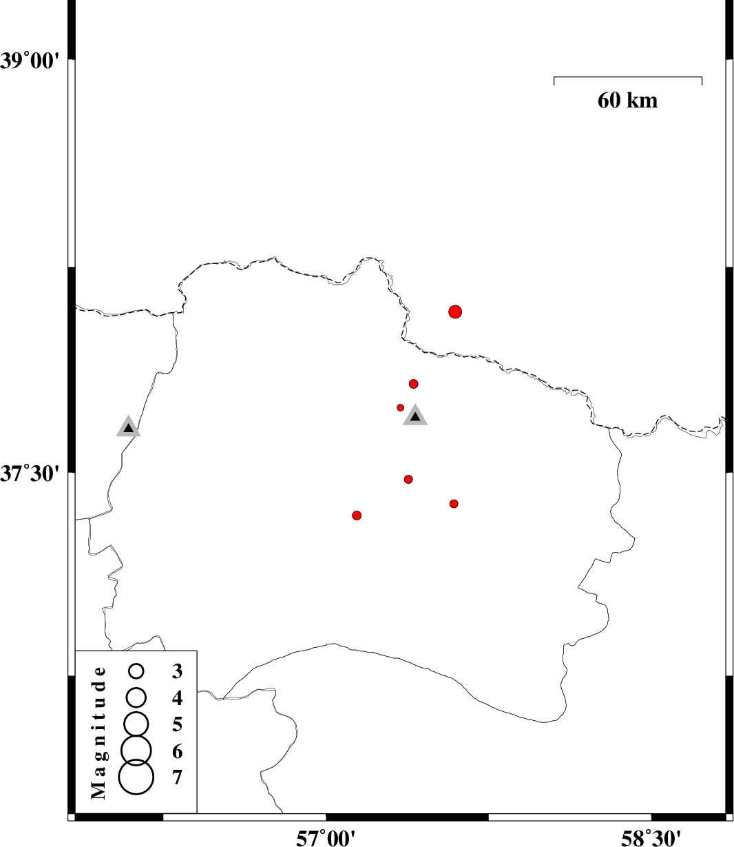 | 2015/10/10 | 02:02:59.4 | 05:32:59.4 | 37.737 | 57.343 | 6 | ML:1.4 | Khorasan(north) Province, 29 km North of Bojnurd | ||