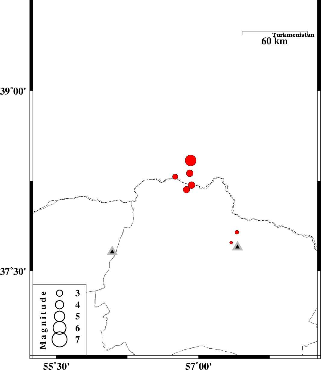 | 2015/10/10 | 02:02:59.4 | 05:32:59.4 | 37.737 | 57.343 | 6 | ML:1.4 | Khorasan(north) Province, 29 km North of Bojnurd |