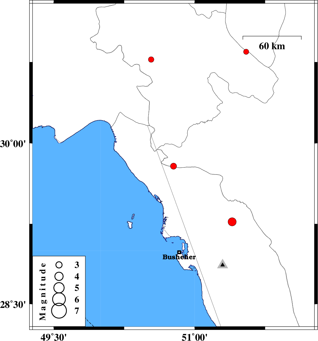 | 2015/10/11 | 01:17:27.9 | 04:47:27.9 | 29.27 | 51.399 | 9 | ML:3.9 | Bushehr Province, 19 km -East of Borazjan |