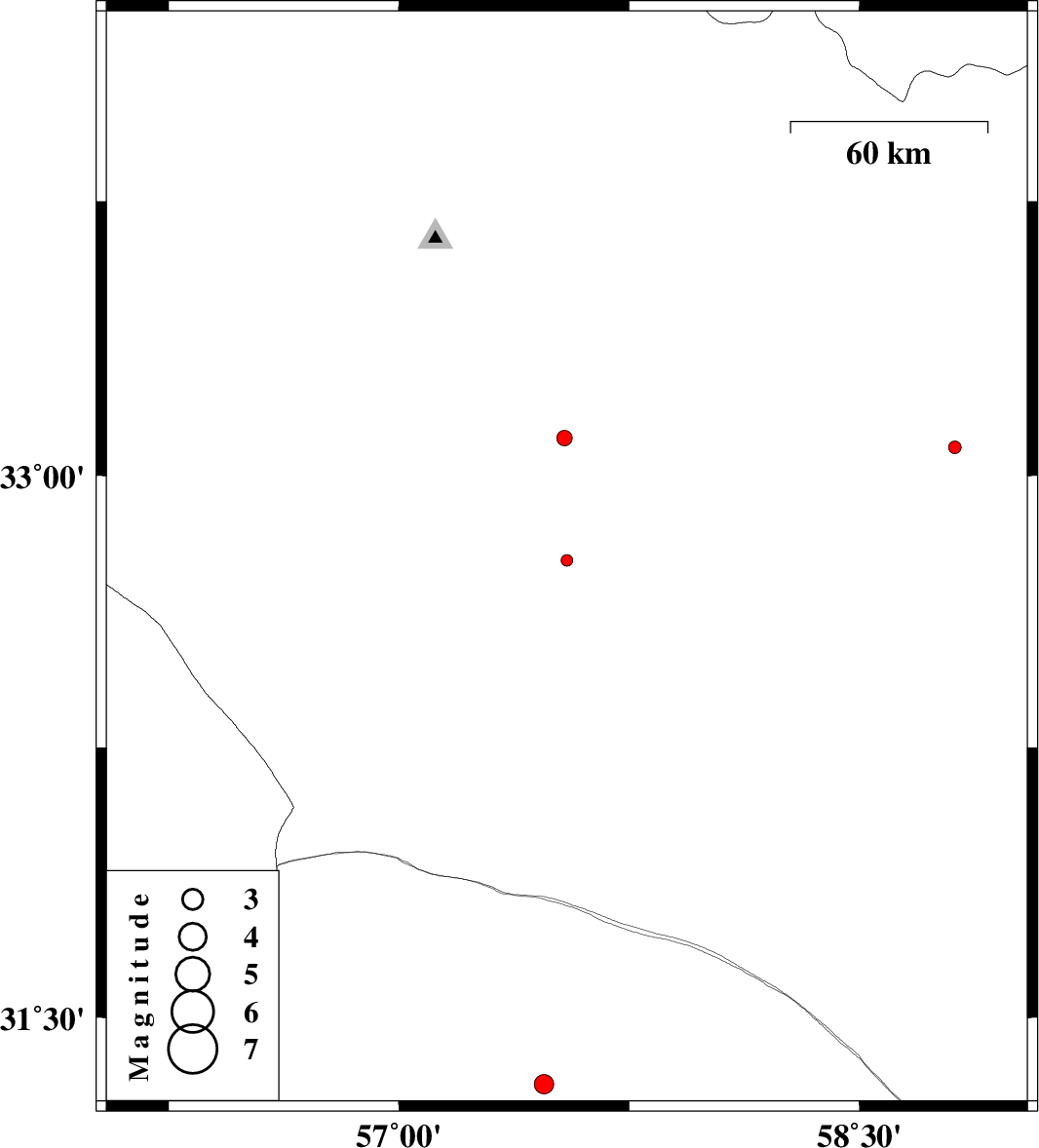 | 2015/10/18 | 02:30:14.7 | 06:00:14.7 | 32.767 | 57.547 | 18 | ML:1.7 | Yazd Province, 109 km South-East of Tabas | ||