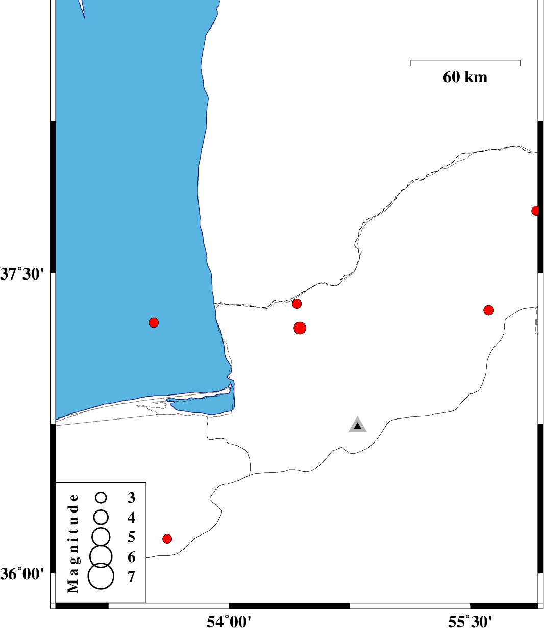 | 2015/09/14 | 14:58:41.2 | 19:28:41.2 | 37.347 | 54.421 | 18 | ML:2.6 | Golestan Province, 37 km North of Aq Qaleh | ||