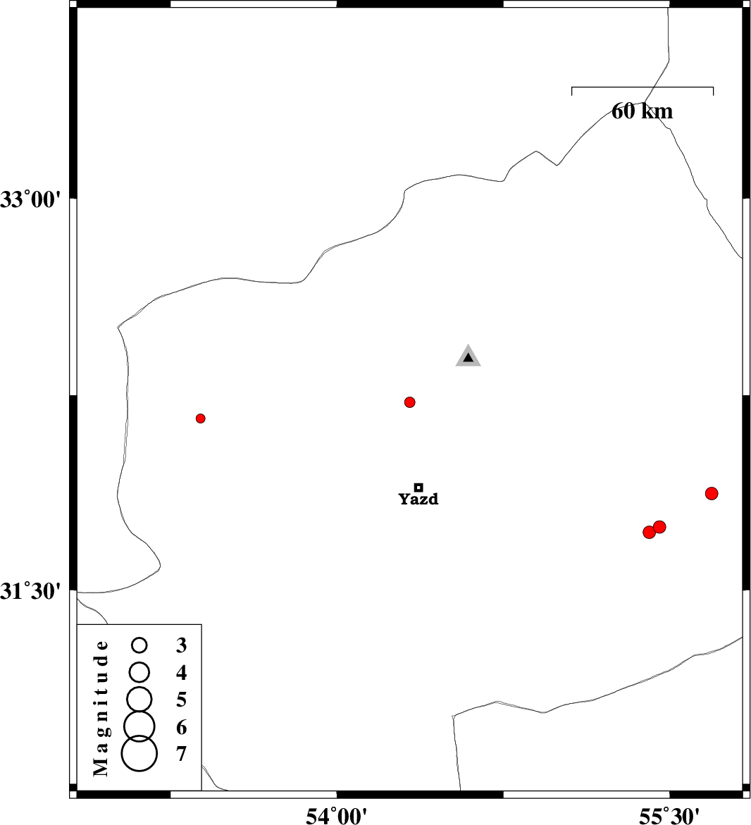 | 2015/10/16 | 10:08:54.6 | 13:38:54.6 | 32.222 | 54.328 | 16 | ML:2.1 | Yazd Province, 25 km North of Ashkezar | ||