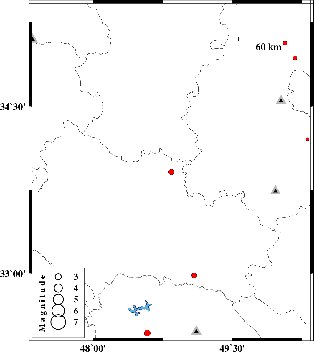 | 2015/10/23 | 09:29:03.5 | 12:59:03.5 | 33.913 | 48.842 | 6 | ML:2.7 | Lorestan Province, 8 km of Borujerd | ||