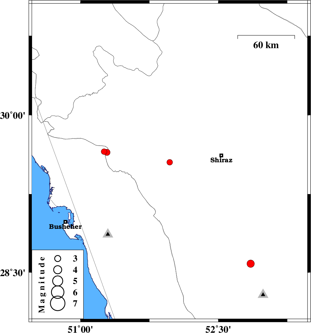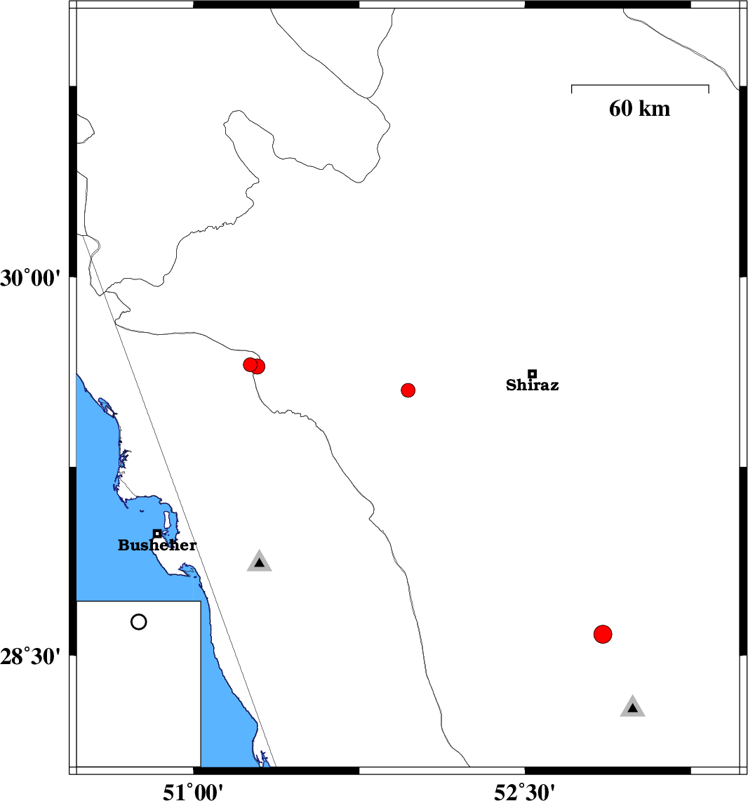 | 2015/11/30 | 12:49:52.1 | 16:19:52.1 | 29.647 | 51.288 | 14 | ML:3.1 | Bushehr Province, 35 km -West of Kazerun | ||