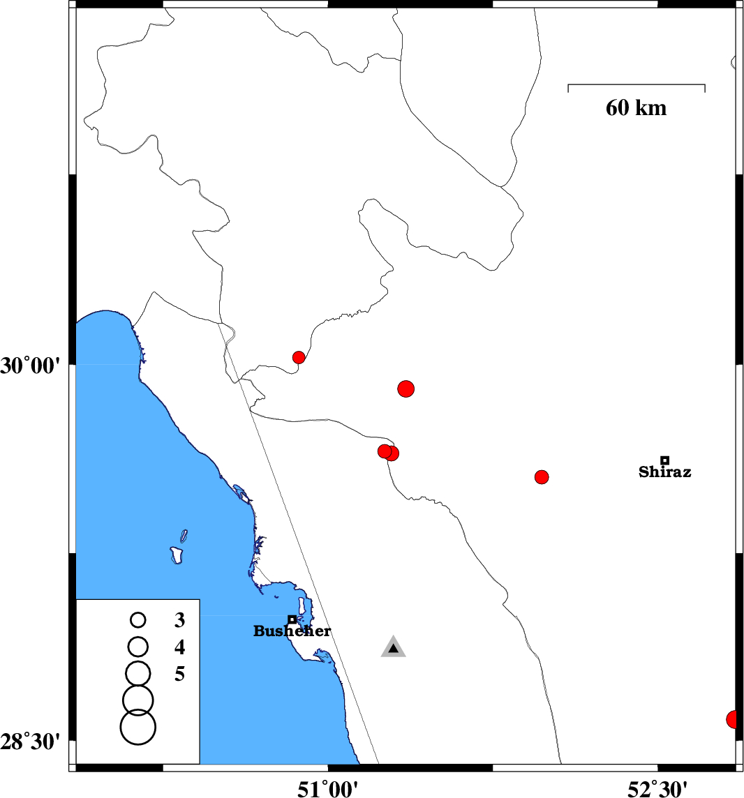| 2015/11/30 | 12:49:52.1 | 16:19:52.1 | 29.647 | 51.288 | 14 | ML:3.1 | Bushehr Province, 35 km -West of Kazerun | ||