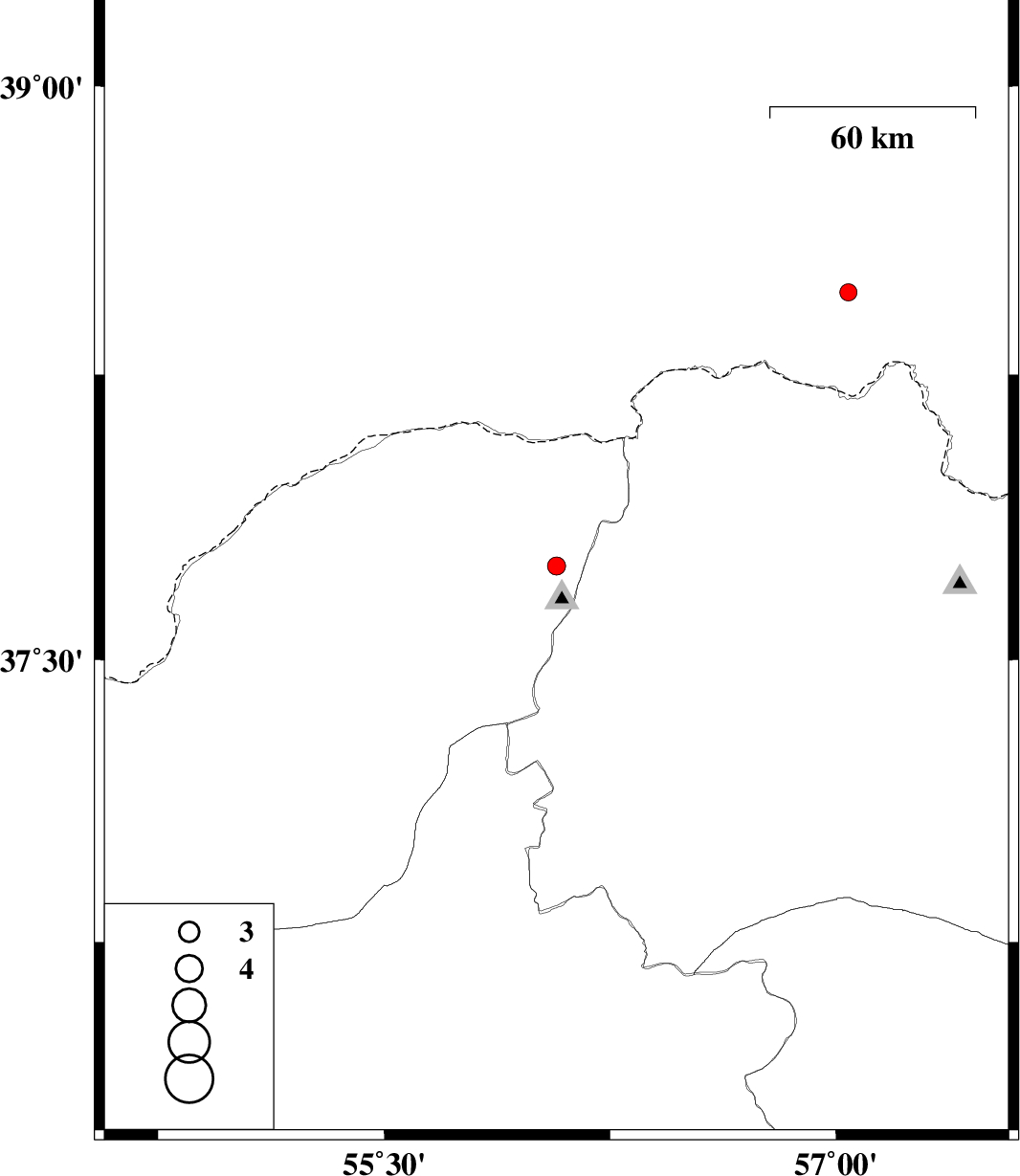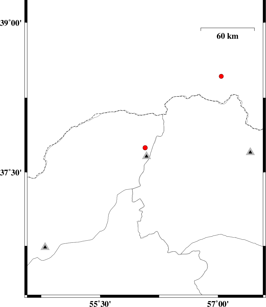 | 2015/12/20 | 03:41:20.3 | 07:11:20.3 | 37.747 | 56.072 | 14 | ML:2.7 | Golestan Province, 65 km North-East of Kalaleh | ||