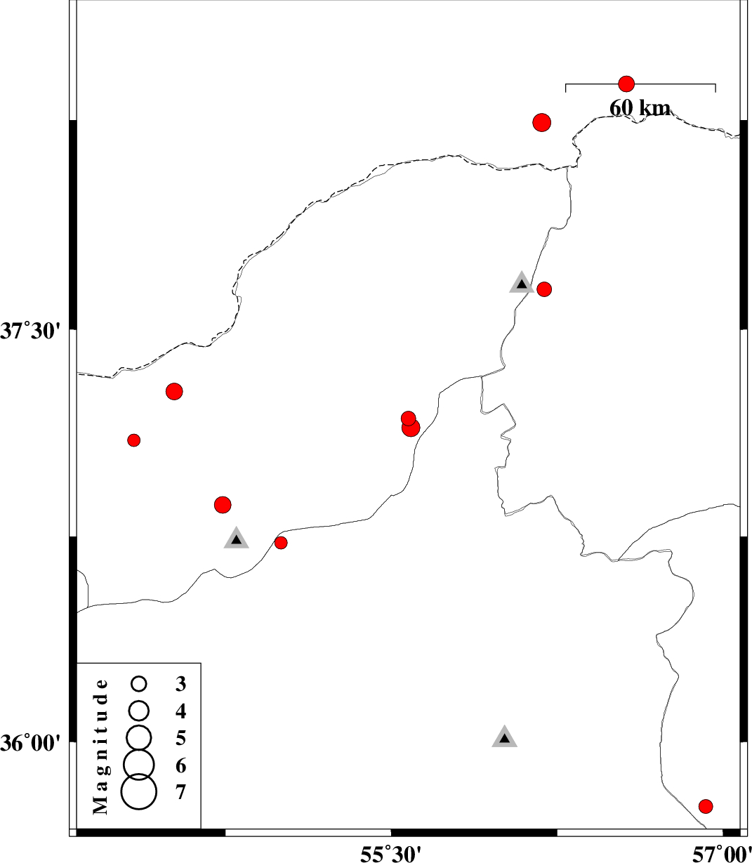 | 2016/02/13 | 01:07:06.4 | 04:37:06.4 | 37.276 | 54.518 | 18 | ML:3.4 | Golestan Province, 30 km North of Aq Qaleh |