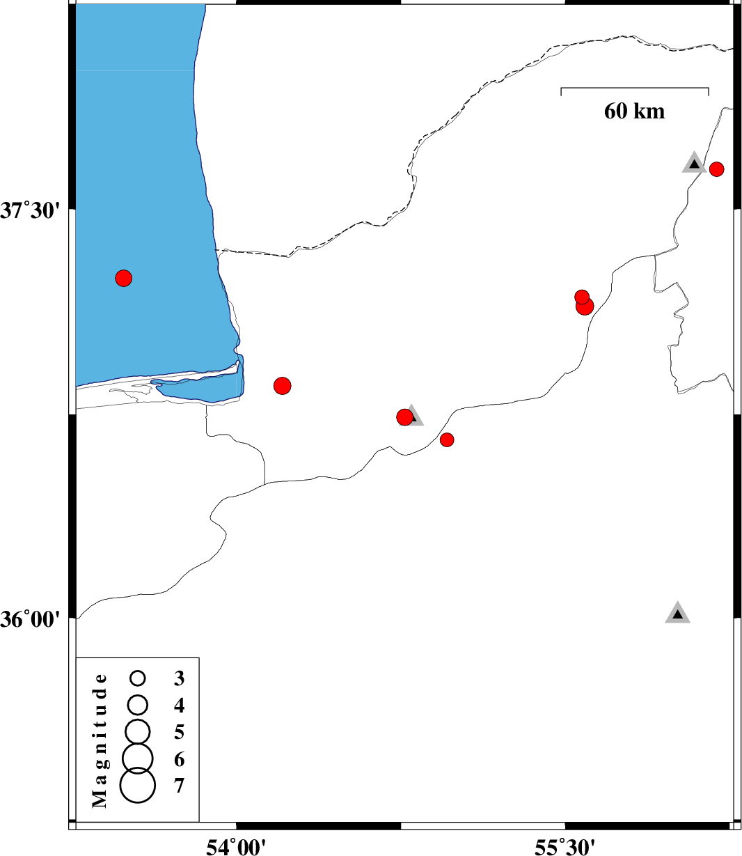 | 2016/04/03 | 05:16:07.4 | 09:46:07.4 | 36.854 | 54.21 | 16 | ML:3.5 | Golestan Province, 11 km -East of Kordkuy | ||