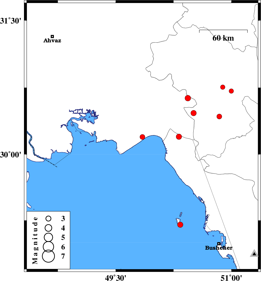 | 2016/05/22 | 07:32:22.2 | 12:02:22.2 | 29.202 | 50.336 | 6 | ML:3.2 | Persian Gulf, 45 km South-West of Bandar-e genaveh | ||