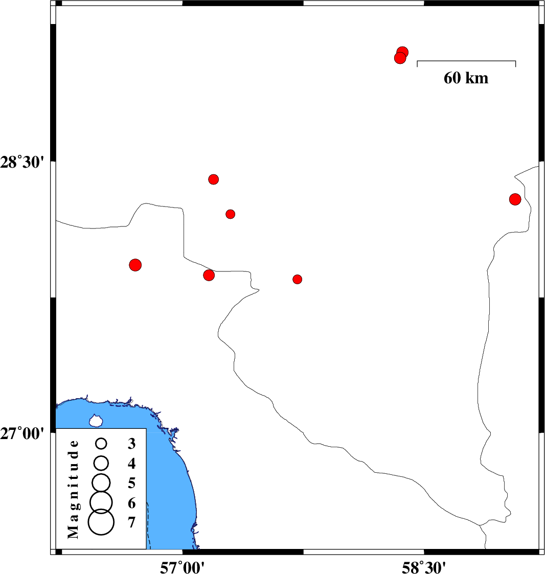 | 2016/06/20 | 03:58:18.2 | 08:28:18.2 | 27.85 | 57.712 | 15 | ML:2.6 | Kerman Province, 11 km South of Kahnuj | ||