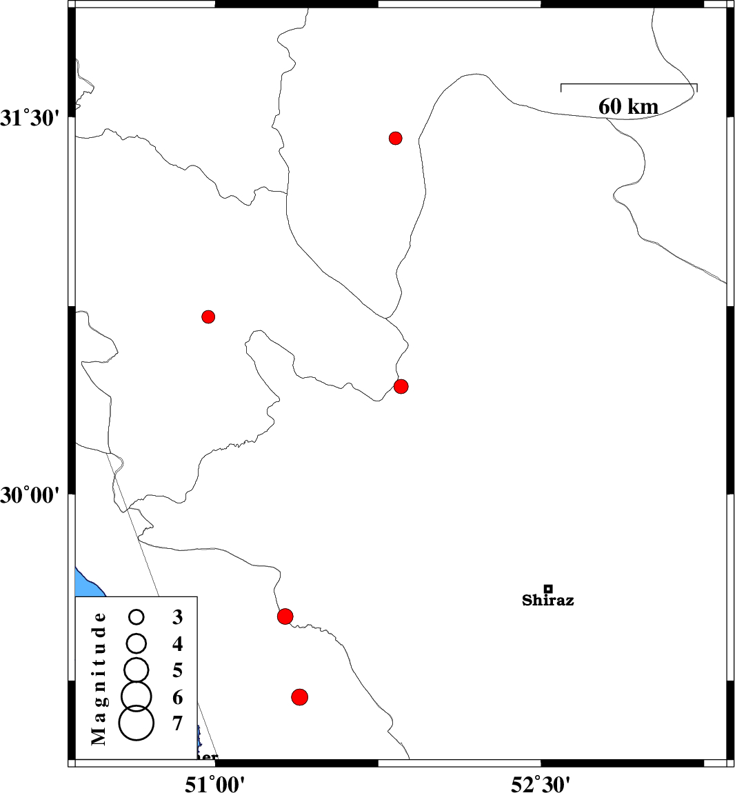 | 2016/06/06 | 04:06:55.5 | 08:36:55.5 | 29.508 | 51.321 | 6 | ML:3.3 | Fars Province, 30 km North-East of Borazjan | ||