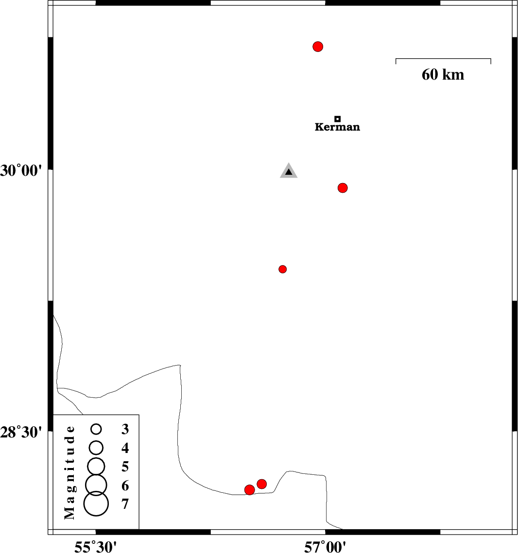 | 2016/07/22 | 02:44:47.2 | 07:14:47.2 | 29.895 | 57.112 | 14 | ML:2.8 | Kerman Province, 44 km South of Kerman | ||