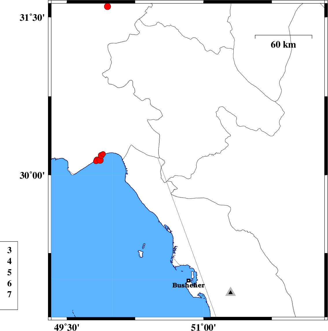 | 2016/08/09 | 17:05:14.5 | 21:35:14.5 | 30.074 | 50.765 | 10 | ML:3.2 | Kohkiluieh va boyerahmad Province, 31 km South of Dogonbadan | ||