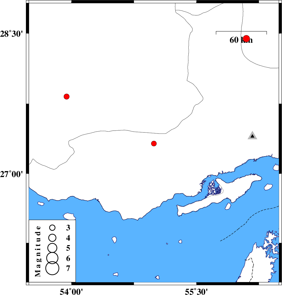 | 2016/09/26 | 18:05:08.9 | 21:35:08.9 | 27.323 | 54.989 | 15 | ML:2.8 | Hormozgan Province, 63 km North-East of Bastak | ||
