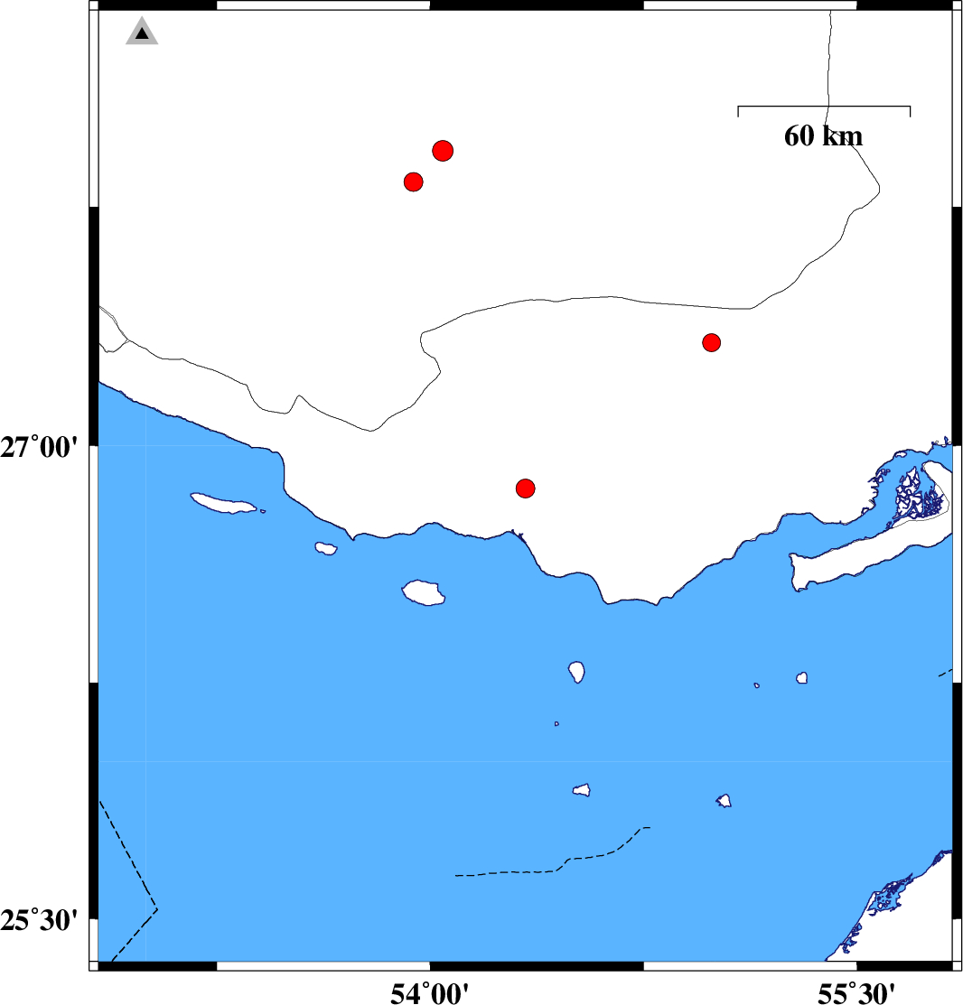 | 2016/09/26 | 18:05:08.9 | 21:35:08.9 | 27.323 | 54.989 | 15 | ML:2.8 | Hormozgan Province, 63 km North-East of Bastak | ||