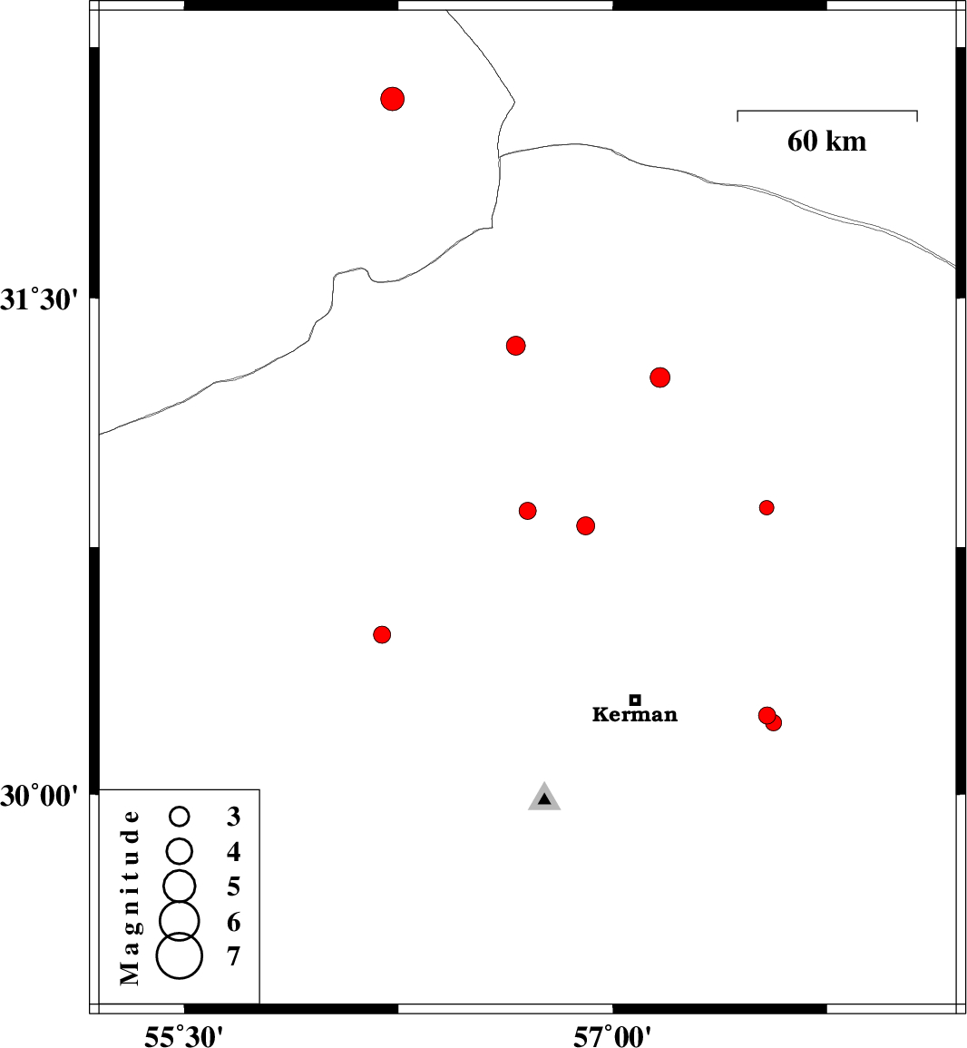 | 2016/09/22 | 10:50:19.3 | 14:20:19.3 | 30.485 | 56.192 | 15 | ML:2.7 | Kerman Province, 21 km -East of Rafsanjan | ||