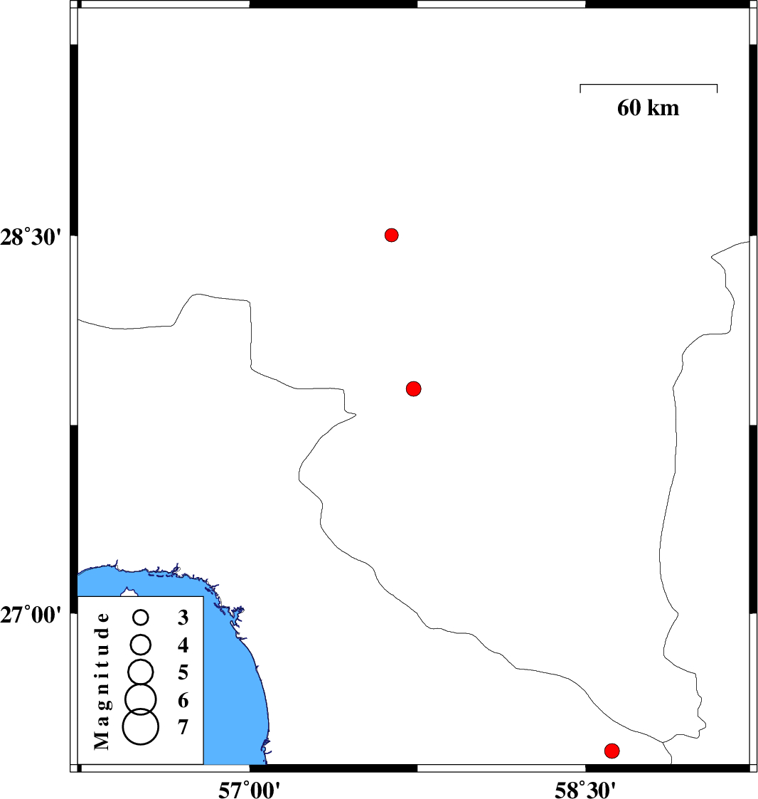 | 2016/10/31 | 06:55:53.2 | 10:25:53.2 | 28.501 | 57.634 | 14 | ML:2.7 | Kerman Province, 21 km South-West of Jiroft |