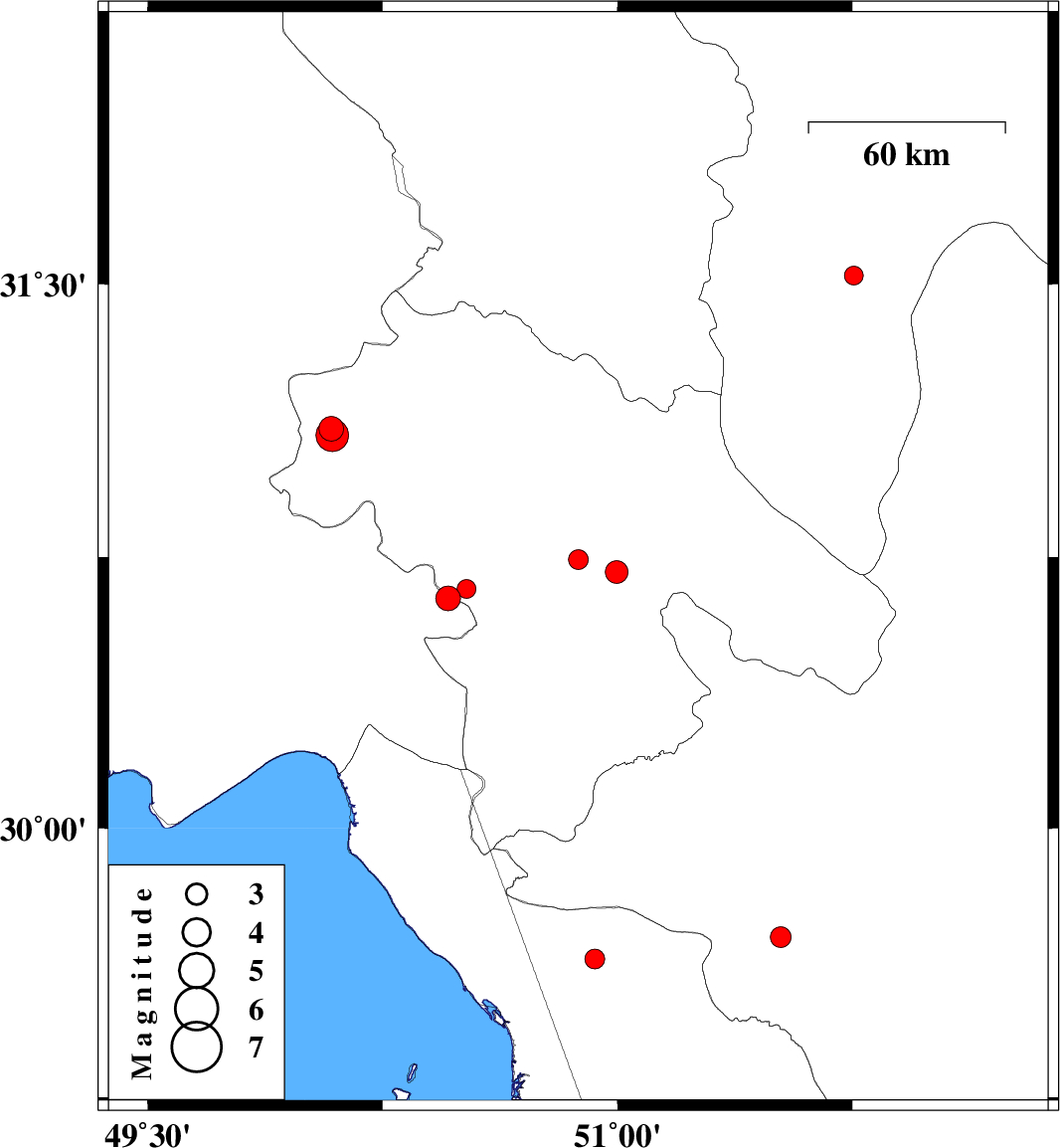 | 2016/10/14 | 01:43:50.2 | 05:13:50.2 | 31.086 | 50.09 | 14 | ML:4.6 | Kohkiluieh va boyerahmad Province, 51 km South-East of Bagh Malek | ||