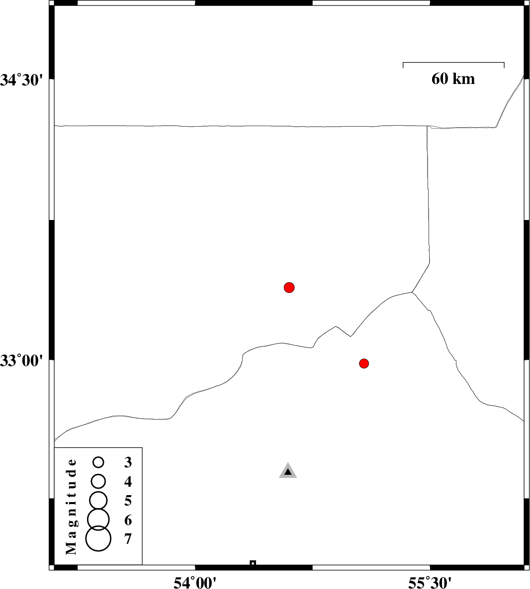 | 2016/10/31 | 09:06:33.6 | 12:36:33.6 | 32.98 | 55.078 | 11 | ML:2.7 | Yazd Province, 156 km North-West of Bafq |