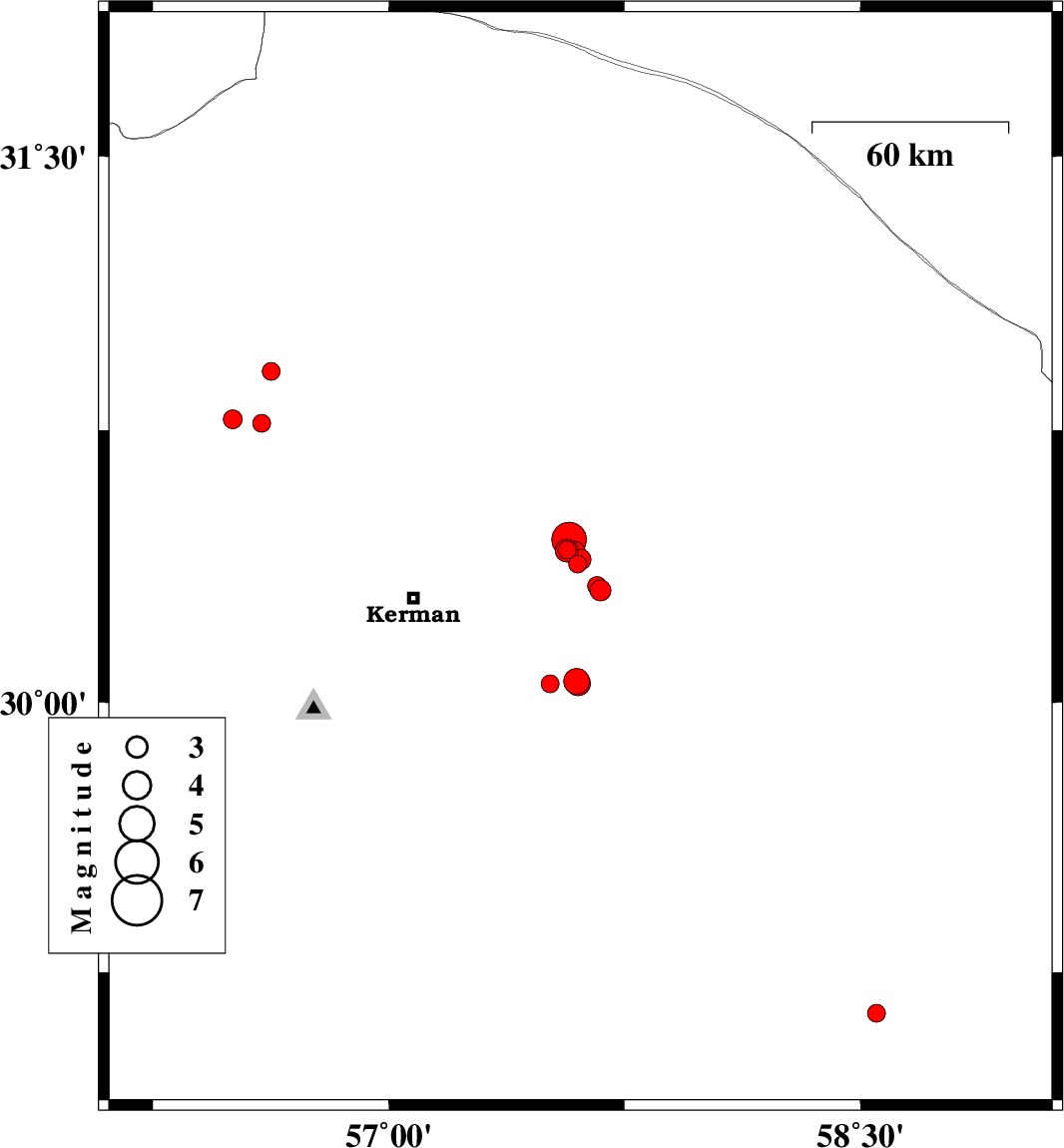 2016/11/10 13:12:11.8 16:42:11.8 30.05157.5146 ML:2.6 Kerman Province, 49 km South-East of Kerman