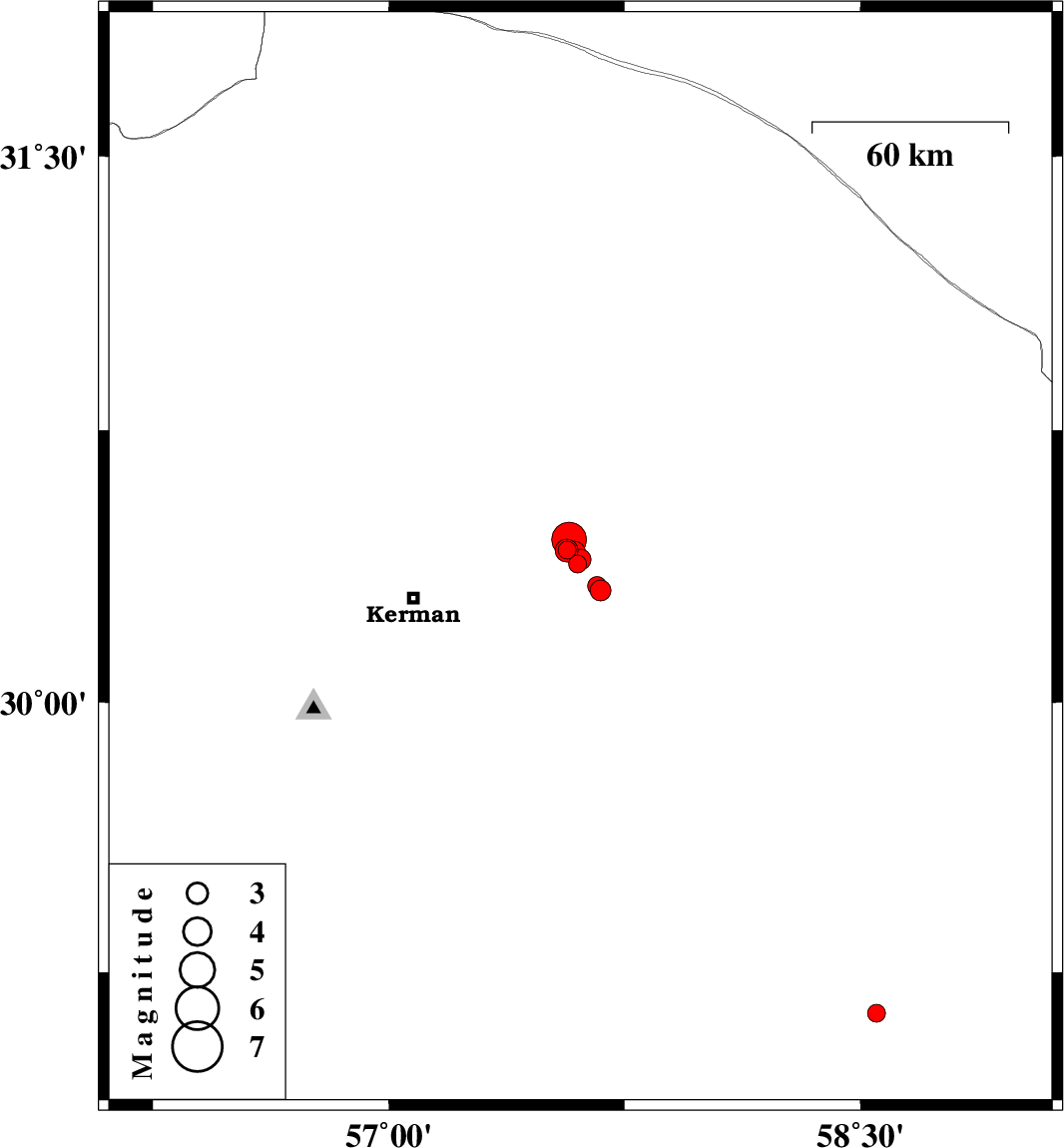 | 2016/12/01 | 10:43:59.3 | 14:13:59.3 | 30.419 | 57.566 | 14 | ML:3.2 | Kerman Province, 49 km North-East of Kerman | ||