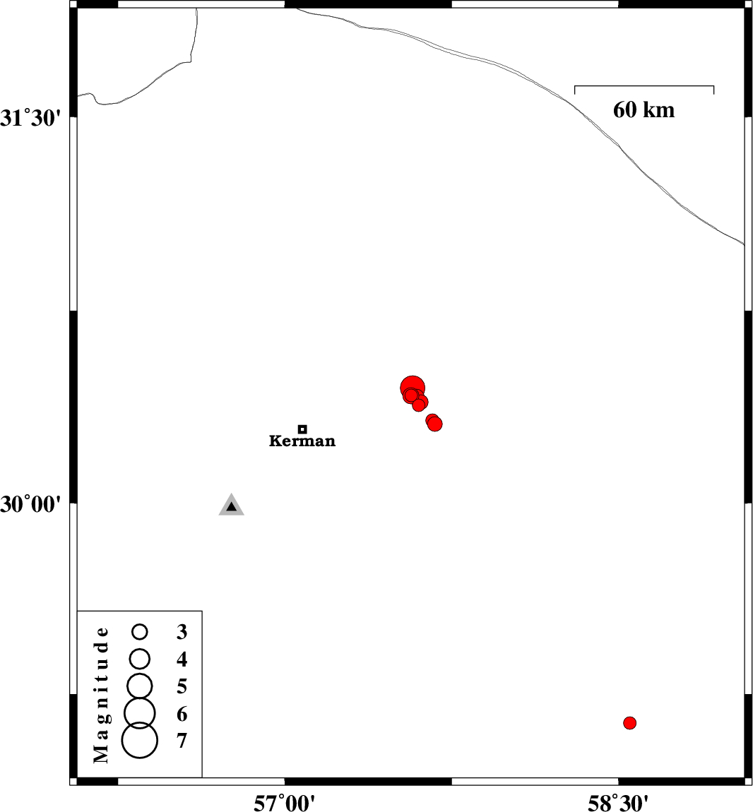 | 2016/12/01 | 10:43:59.3 | 14:13:59.3 | 30.419 | 57.566 | 14 | ML:3.2 | Kerman Province, 49 km North-East of Kerman | ||