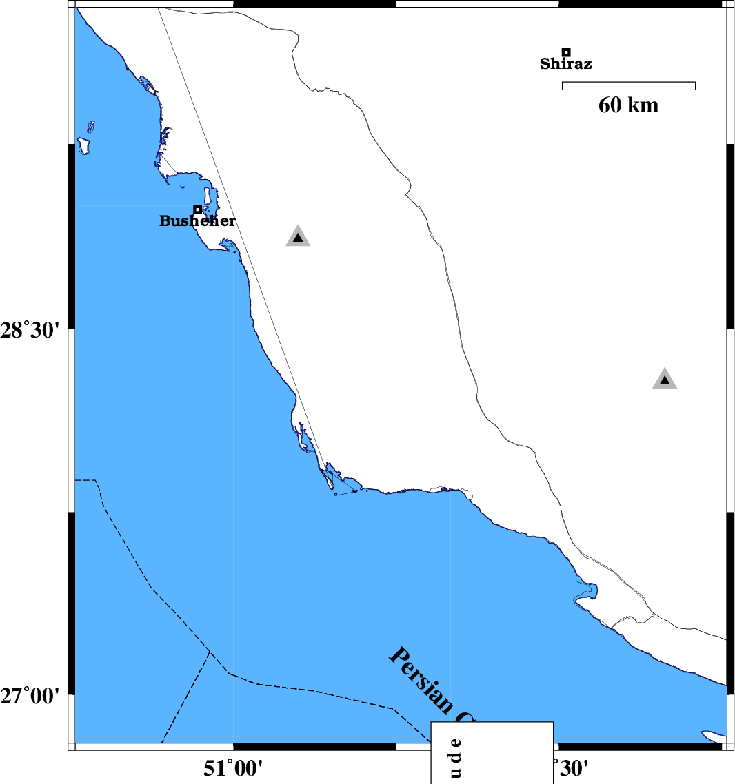 | 2016/12/13 | 18:44:11.1 | 22:14:11.1 | 28.3 | 51.772 | 22 | ML:2.7 | Bushehr Province, 55 km South-East of Khormog | ||