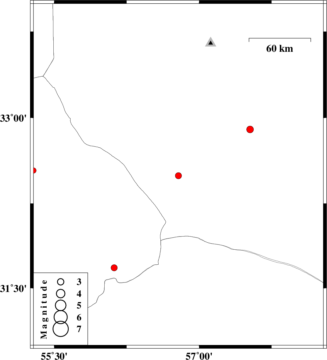 | 2016/12/22 | 04:25:51.4 | 07:55:51.4 | 32.899 | 57.528 | 8 | ML:3.3 | Yazd Province, 96 km South-East of Tabas | ||