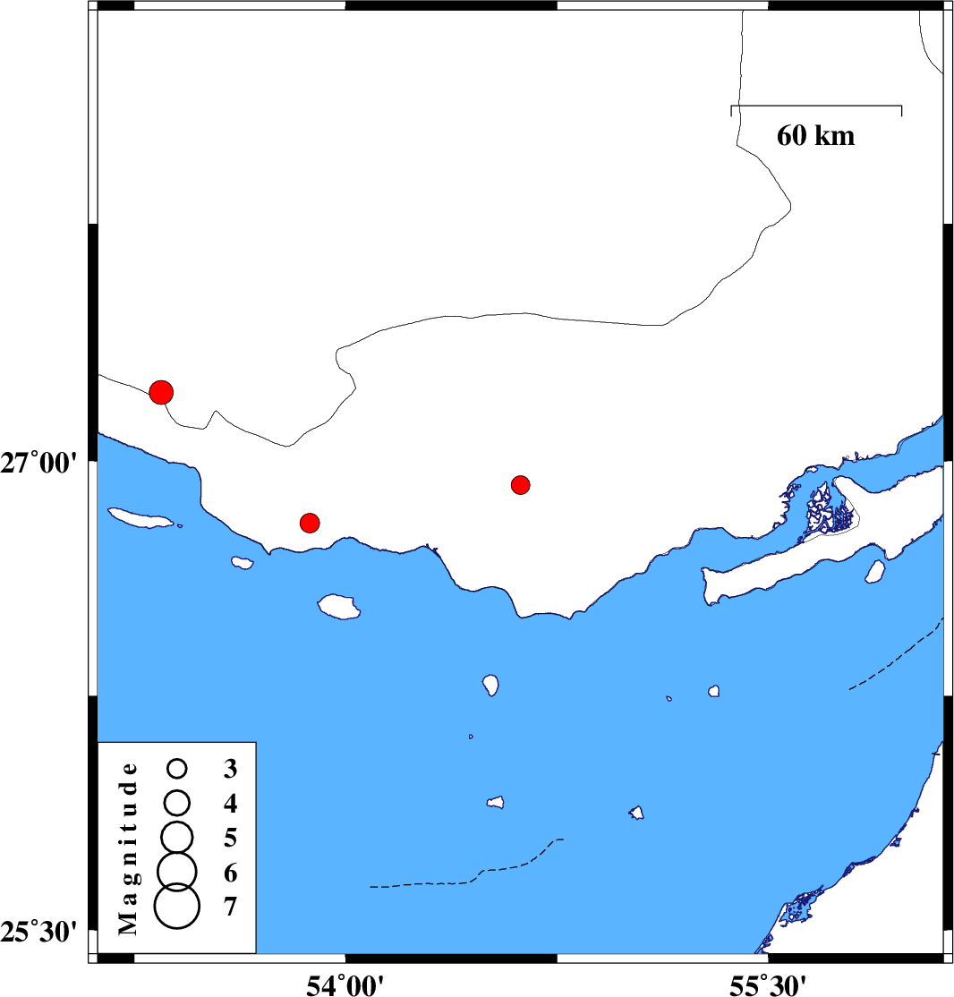 | 2017/01/03 | 14:14:13.3 | 17:44:13.3 | 26.923 | 54.62 | 17 | ML:3 | Hormozgan Province, 40 km South-East of Bastak | ||